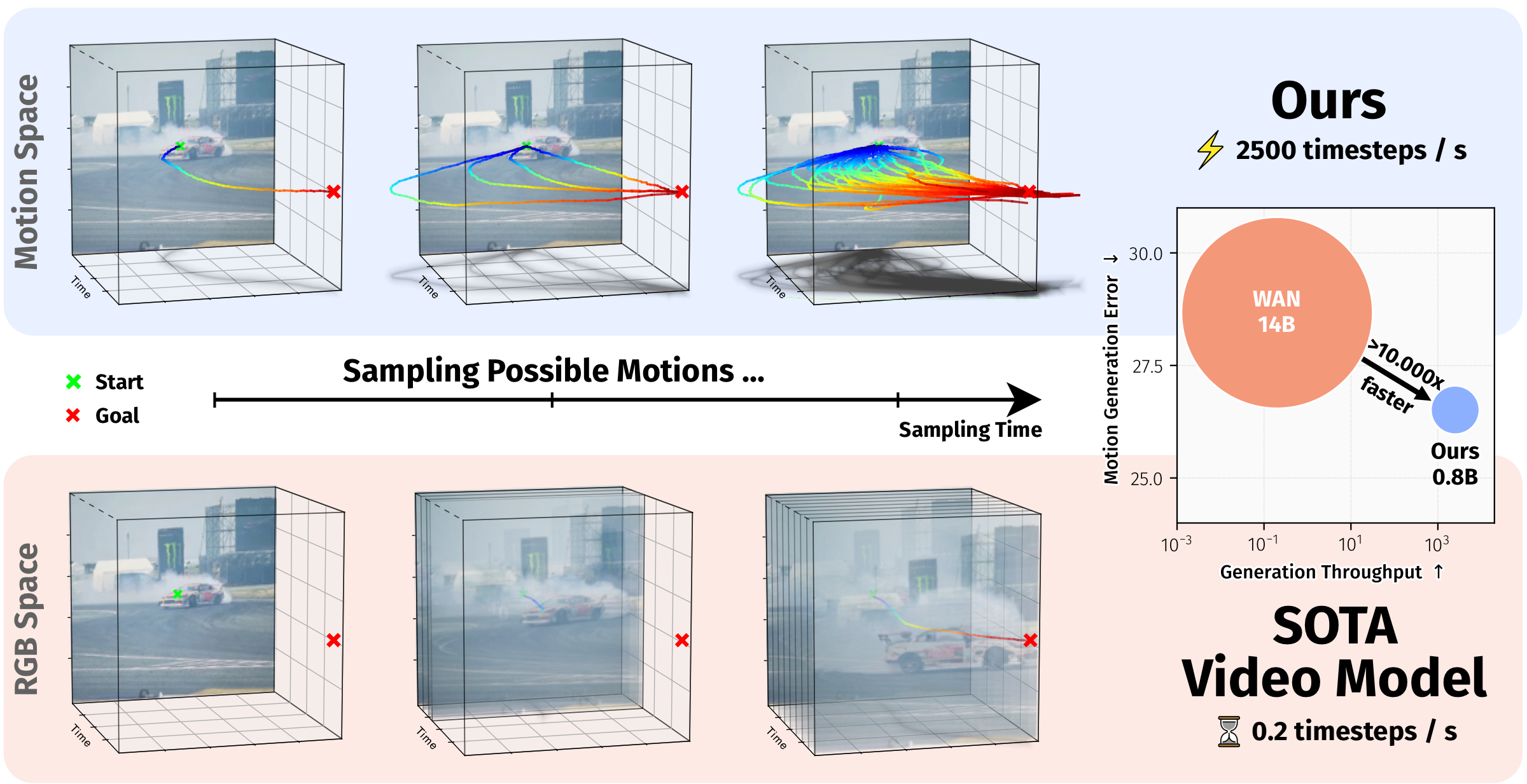 ZipMo teaser figure ZipMo generates long-horizon motion in a compact learned motion space, supporting spatial-poke conditioning for open-domain videos and task-conditioned action prediction on LIBERO.