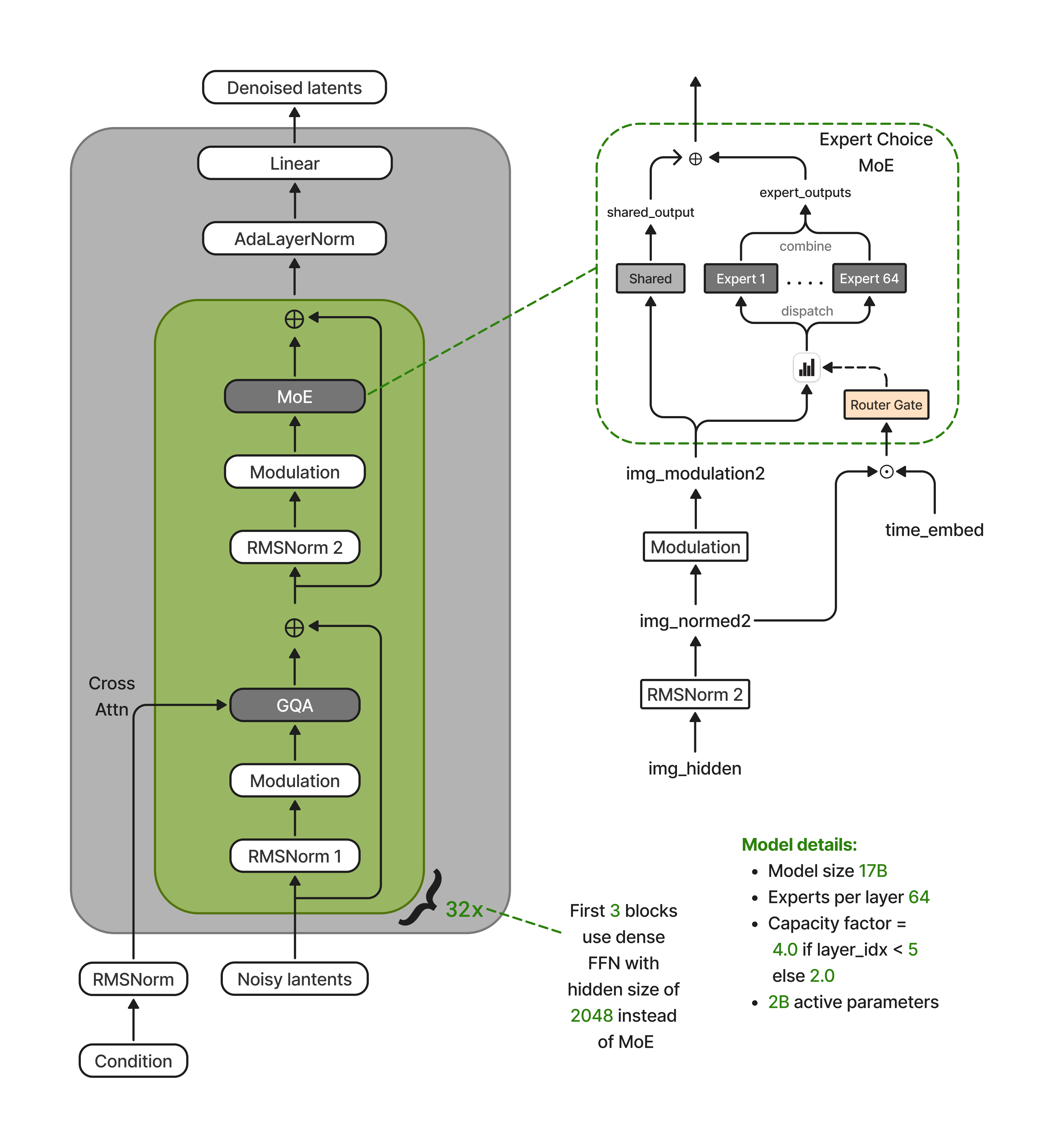 Nucleus-Image is a 32-layer diffusion transformer where 29 of the 32 blocks replace the dense FFN with a sparse MoE layer containing 64 routed experts and one shared expert (the first 3 layers use dense FFN for training stability). Image queries attend to concatenated image and text key-value pairs via joint attention. Text tokens are excluded from the transformer backbone entirely, participating only as KV contributors. This eliminates MoE routing overhead for text and enables full text KV caching across denoising steps.
