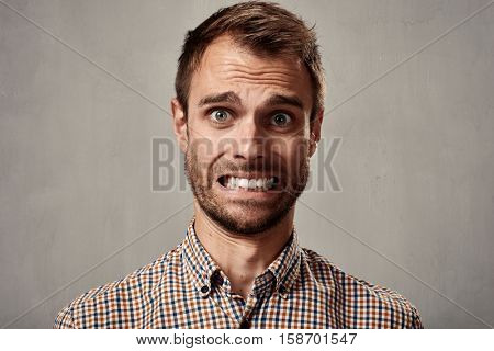 Stylish portrait of adult caucasian man with angry face and who seems like maniac. His face is twisted with anger. Man's teeth in bad condition. Isolated on white. | 78,443 | |