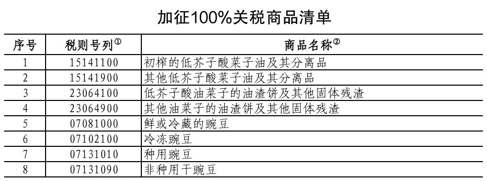 其中,对菜籽油、油渣饼、豌豆加征100%关税;对水产品、猪肉加征25%关税,且此次进入加征关税清单的商品,是在现行适用关税税率基础上分别加征相应关税,现行保税减免税政策不变,此次加征的关税不予减免。