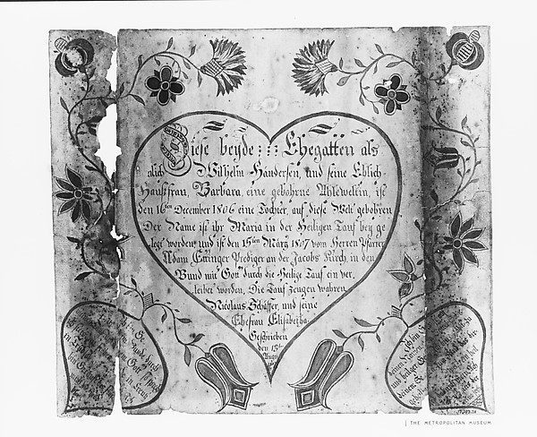 Baptismal certificate | Baptismal Certificate | 1807 | 323 | false | false | true | The American Wing | 1917 | American | null | 1,807 | 1,807 | Paper | 9 3/4 x 11 3/8 in. (24.8 x 28.9 cm) | Rogers Fund, 1917 | http://www.metmuseum.org/art/collection/search/323 | null | Metropolitan Museum of Art, New York, NY | 000000278 | success | null | null | null | null | null | {} | e34c9c362cda5f407e91d66ddb2ea2239af408e1e87469d9560225a6830510da | ||||||||||||||||||||||||||||||||||||