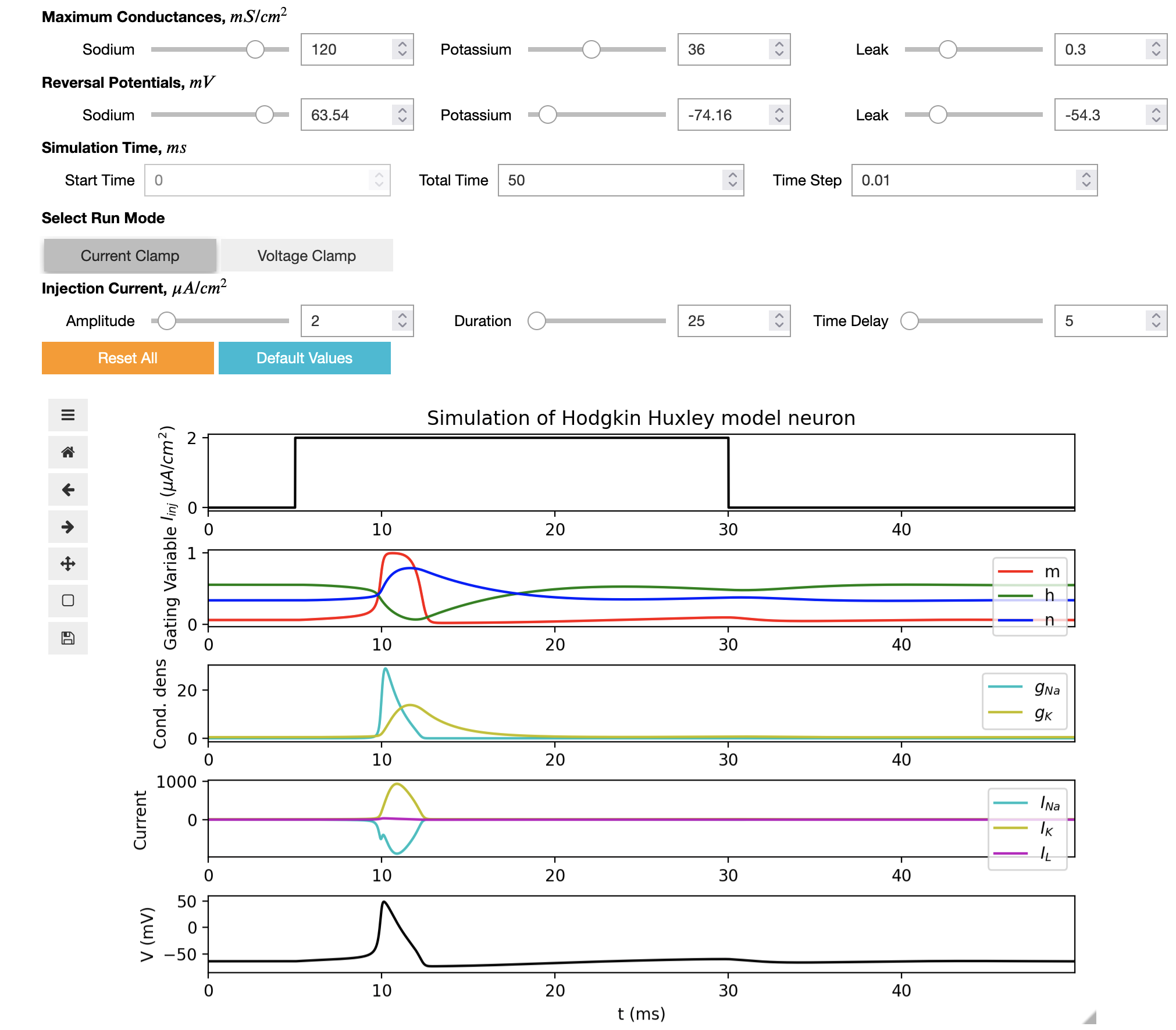 ## Jupyter notebook for the Hodgkin Huxley model This is an interactive web notebook using [Jupyter technologies](https://jupyter.org/) which can be used to run the HH model, change the parameters of the model and display the dynamical properties of variables.